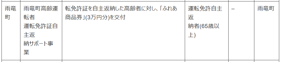北海道雨竜町では、免許証を返納した高齢者に『ふれあい商品券』を3万円分渡しています。